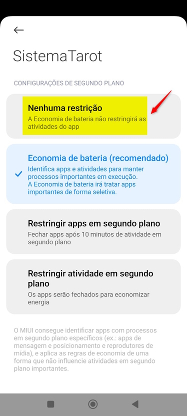 Em celulares mais recentes será exibido uma janela em tela cheia com o título "**Configurações de Segundo Plano**", clique em "**Nenhuma Restrião**":